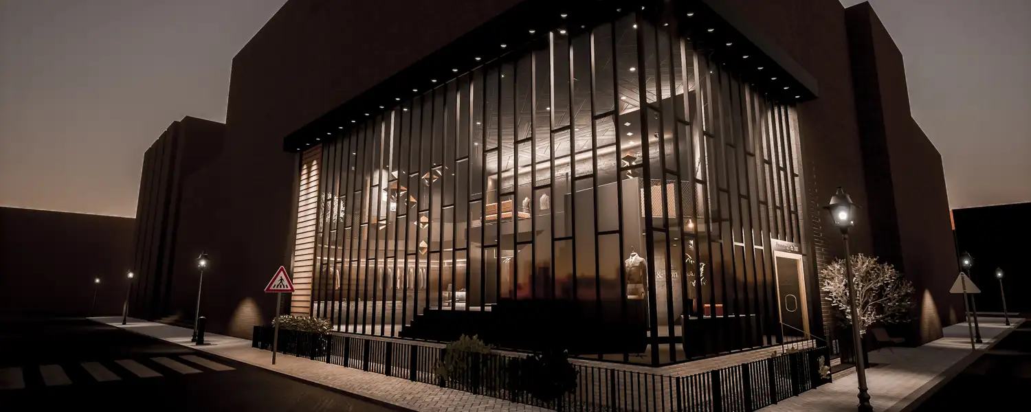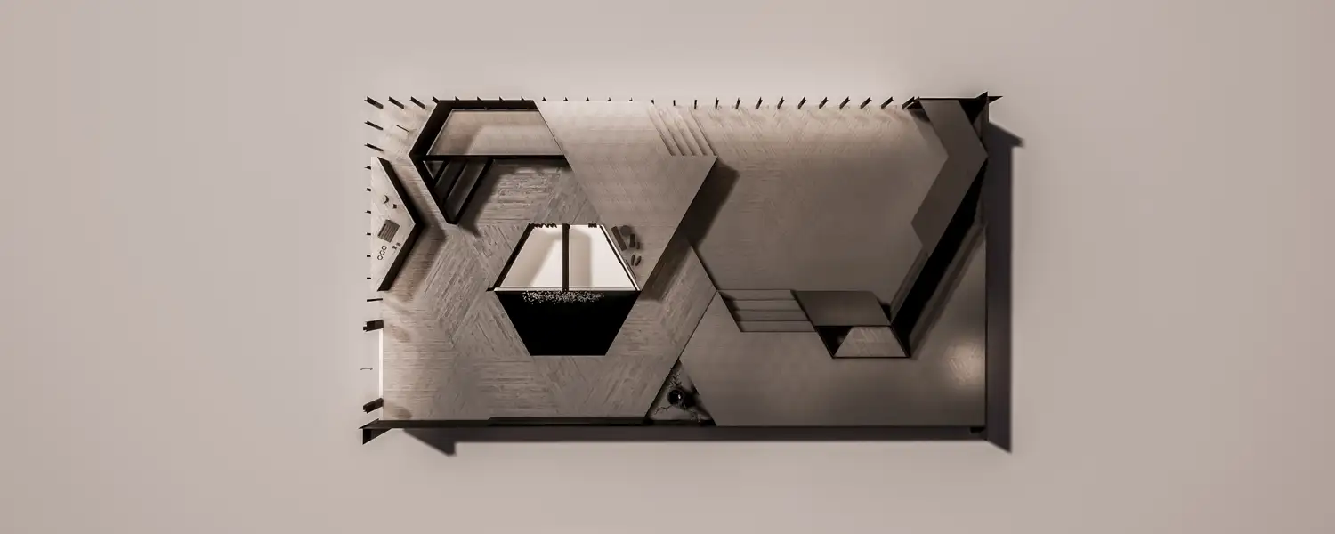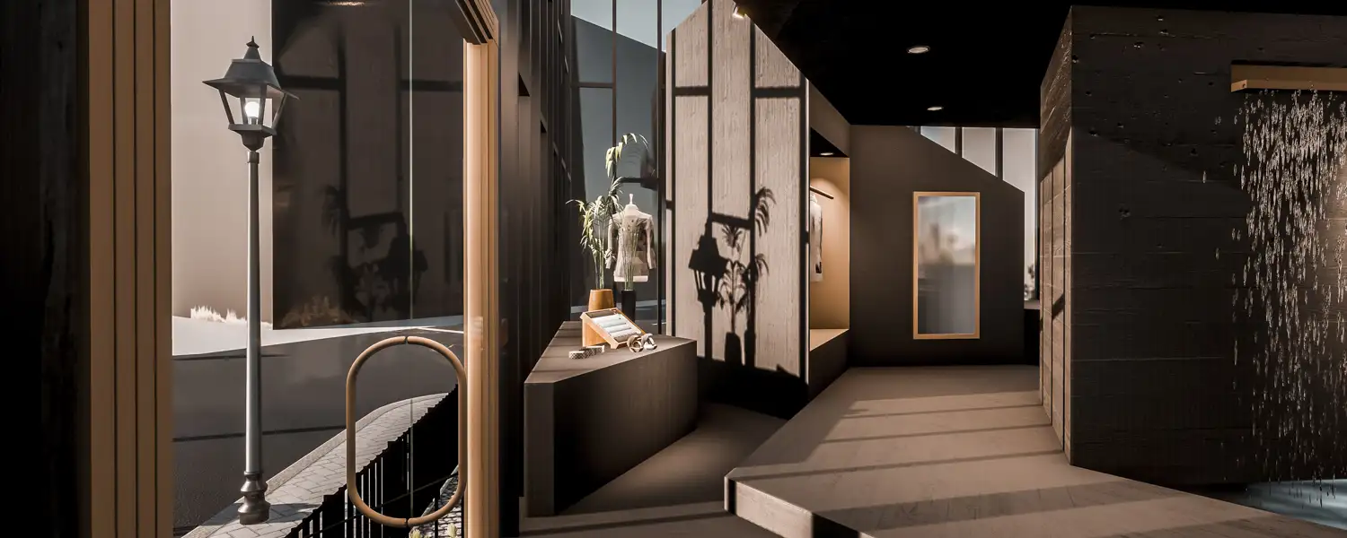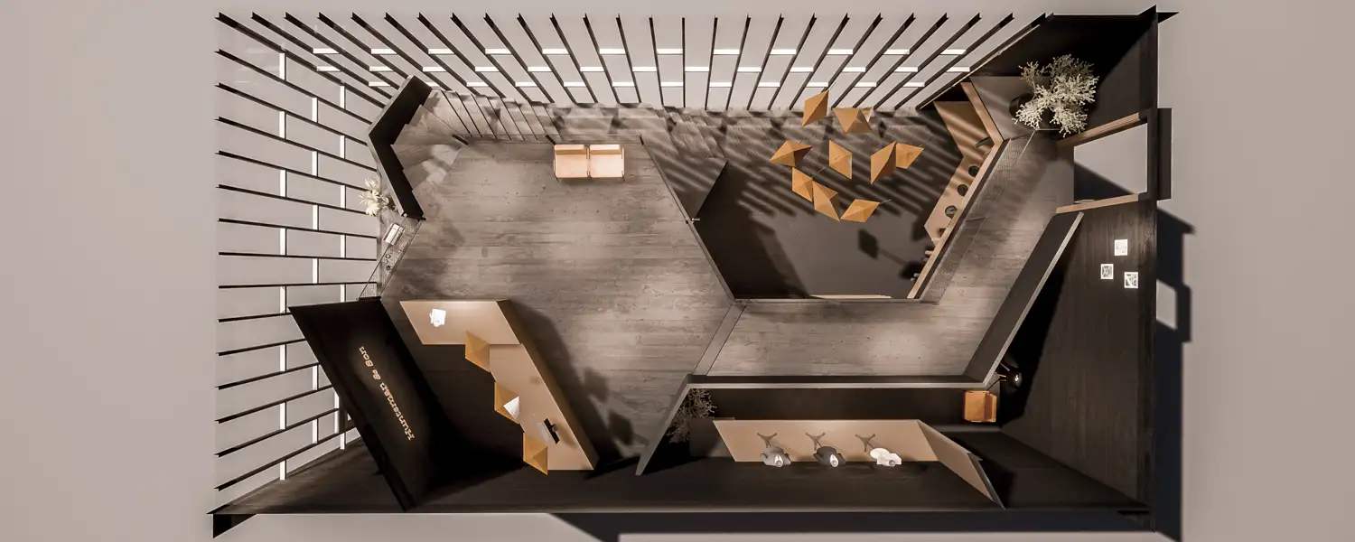 Das der Gesamtarchitektur zugrundeliegende Hexagon-Patternin wurde in einer Form interpretiert, das dem Geschäft ein kontrastreiches Wechselspiel zwischen den verschiedenen Ebenen sowie offenen und verschlossenen Bereichen gibt. Die sich dadurch ergebenen vielfältigen Blickachsen sind das Herzstück meines Entwurfs.