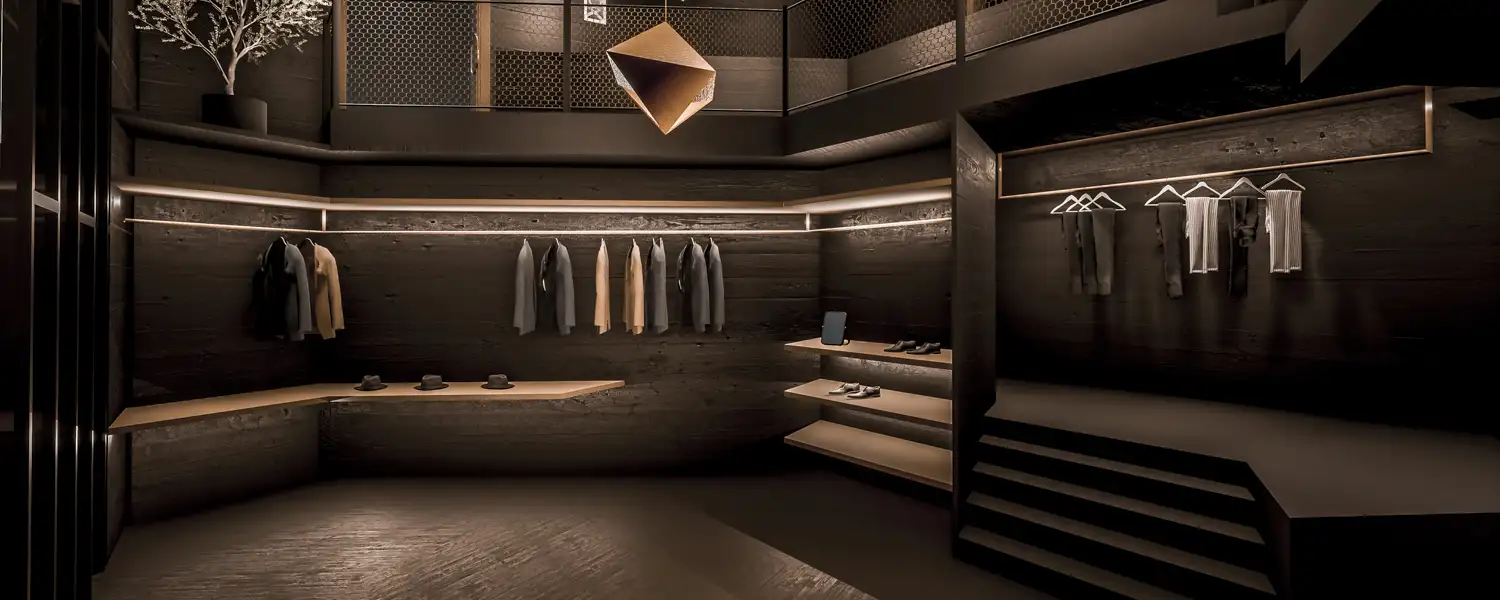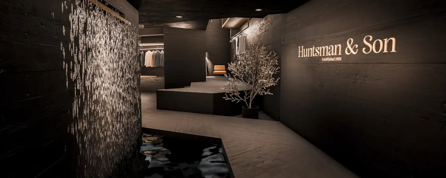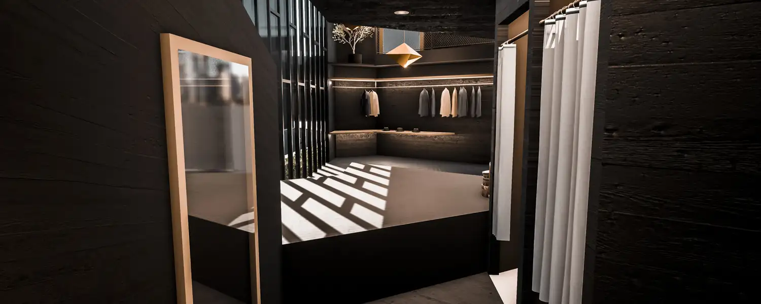 Anfangs mit der Intension rangegangen, aus den geformten Räumlichkeiten einen Shop für Surfbedarf zu gestalten, zeigte sich im Arbeitsprozess jedoch, dass die Verkaufsfläche besser geeignet ist, um eher weniger und exklusivere Waren anzubieten. Dies hat mich dazu bewogen, in die Räumlichkeiten einen hochwertigen Herrenausstatter einziehen zulassen. Die gesamte Architektur setzt in den verschiedenen Bereichen des Shops sehr klar seinen Fokus auf den vorgesehen Nutzen: Der Entree in das Geschäft im ersten Stock wird durch den langen Steg regelrecht zelebriert, von hier bekommt der Kunde einen guten Überblick über das gesamte Geschäft, die Struktur erschließt sich schnell. Die Kasse, bzw. der Empfangstresen hat ebenso einen Bereich für sich allein, wie auch die Umkleidekabinen direkt darunter. Dem großen, offene Bereich im Souterrain kommt die Hauptaufgabe eines Geschäfts zu, hier werden ausgewählte Maßanzüge und Assesoires präsentiert, dazugehörige Hosen finden sich leicht abgesetzt auf einer Podestebene daneben. Diesem Bereich kommt zudem die Repräsentation der Waren nach Außen zu. Durch die große Fensterfront, der sich ein Großteil der Architektur zuwendet, bietet sich dem Passanten ein besonders guten Blick auf die Anzüge, ein gesondertes Schaufenster ist somit nicht mehr erforderlich. Ein zweiter Eingang von Außen ist ebenso imposant, wie der im Obergeschoss. Der Kunde wird von hier kommend über einen Steg gerahmt von einem Wasserfall und dem einem großen Markenschriftzug direkt in den Verkaufsbereich geleitet.
