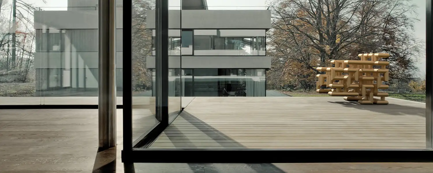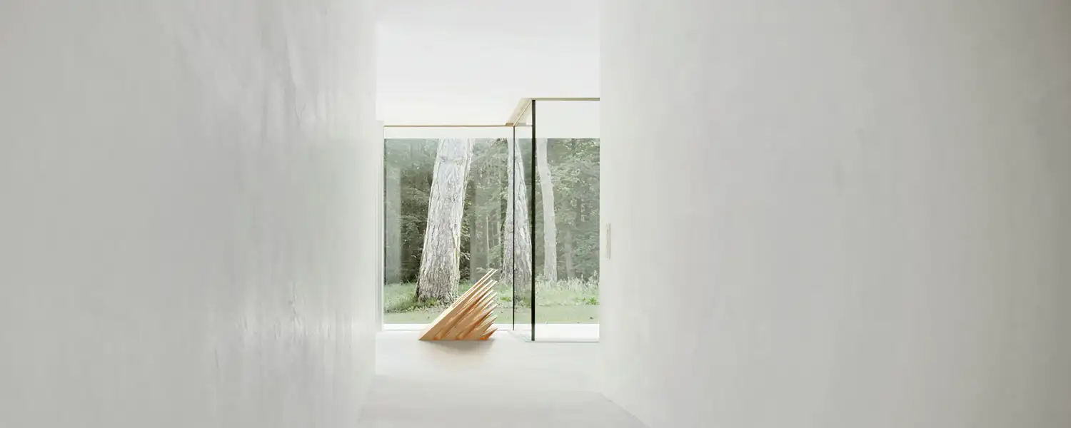 Die Exklusivität der Waren spiegelt sich im Farbchema und der Materialauswahl in dem Geschäft wieder. Als neutrales und sich zurücknehmendes Hauptmaterial macht schwarzer Beton beinahe die gesamte Architektur aus. Um nicht zu kühl zu wirken, wurde der Beton in Holzschalungen gegossen, sodass die Holzmaserung überall an Wänden und Böden erkennbar ist. Ergänzt wird dieser durch goldfarbene Applikationen an ausgewählten Stellen und eine hölzerne Decke, die Eleganz und Wärme Ausstrahlen soll. Die Fenstersäulen ist mit gebürstetem Aluminium verkleidet.